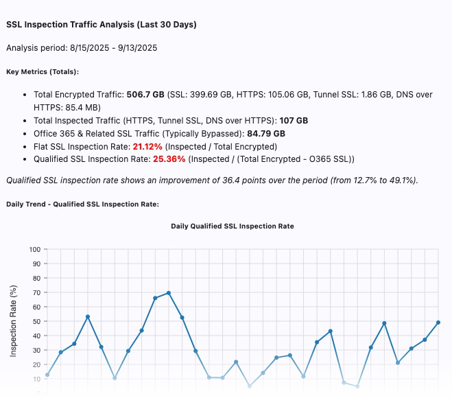 Transform hours of manual data gathering into instant, actionable reports with traffic analytics, configuration details, and optimization recommendations — exportable for stakeholder sharing.